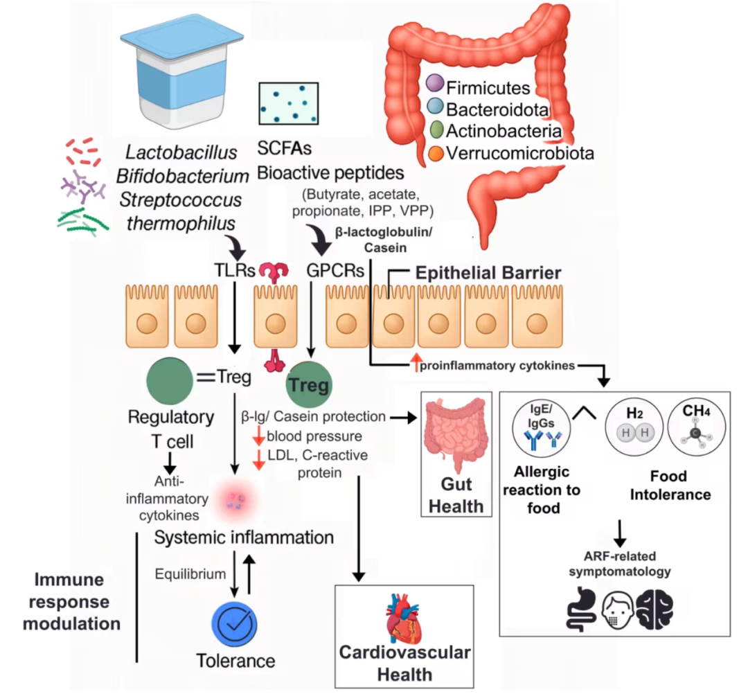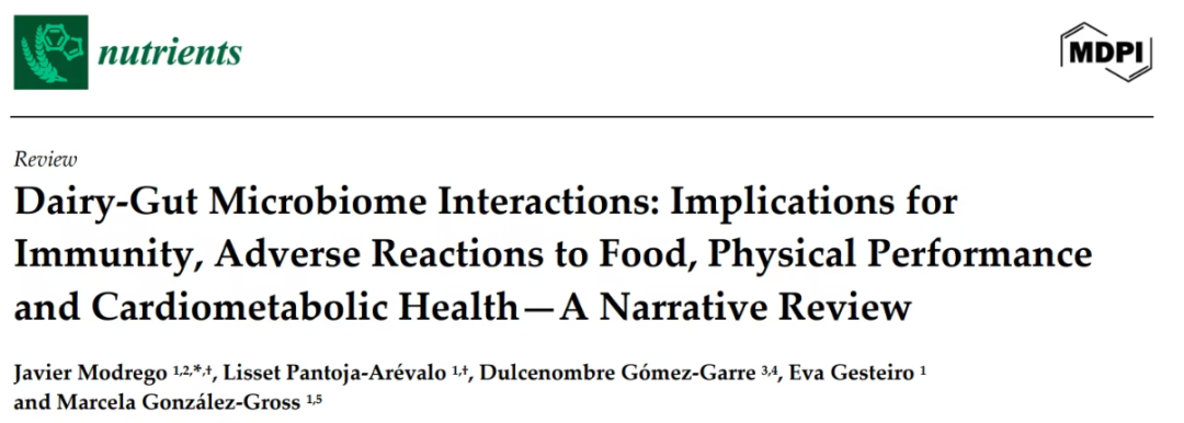 [1]Modrego, J.; Pantoja-Arévalo, L.; Gómez-Garre, D.; Gesteiro, E.; González-Gross, M. Dairy-Gut Microbiome Interactions: Implications for Immunity, Adverse Reactions to Food, Physical Performance and Cardiometabolic Health—A Narrative Review. Nutrients 2025, 17, 3312. https://doi.org/10.3390/nu17203312