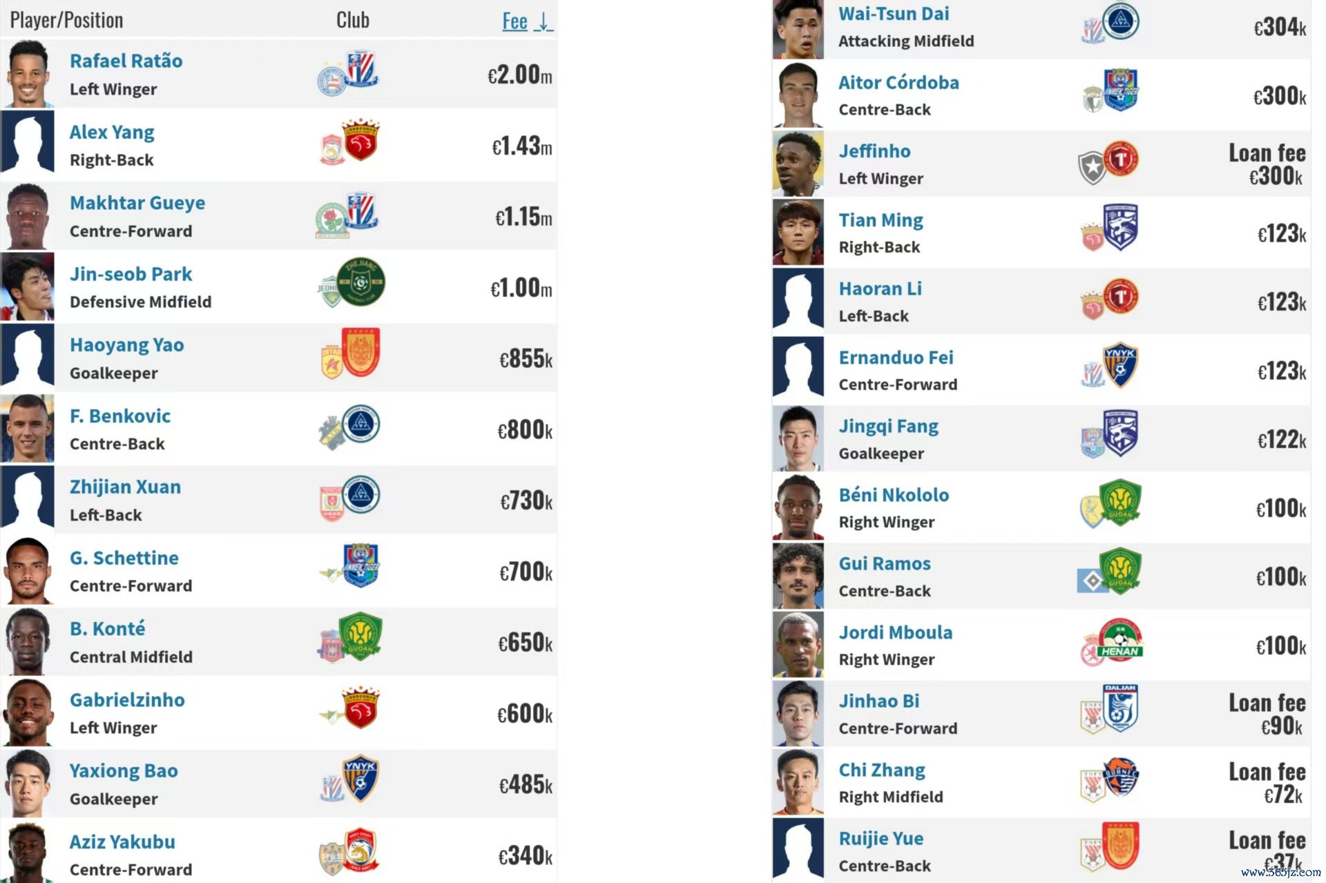 中超冬季转会窗即将关闭,德转也更新了相应的转会、租借费用明细。截止25号下午,已经更新的榜单如下: